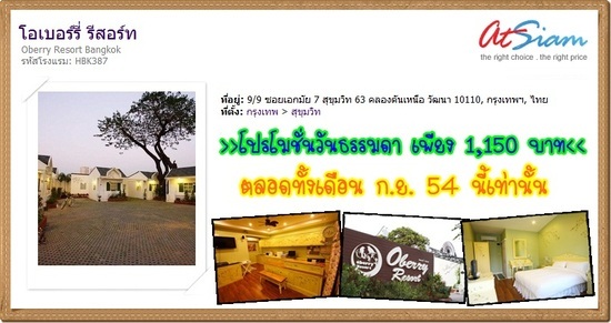 โปรโมชั่นวันธรรมดา เพียง 1,150 บาท ที่ โอเบอร์รี่ รีสอร์ท (กรุงเทพ) สอบถามเพิ่มเติมโทร : 02-9334142