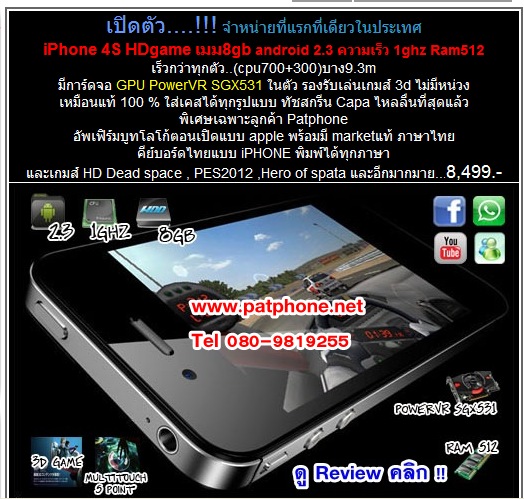 ดูภาพมือถือจริงทุกรุ่นได้ที่webด้านล่างนะคะ http://www.patphone.net http://www.patphone.net http://www.patphone.net http://www.patphone.net iPhone 4S HDgame เมม8gb android 2.3 ความเร็ว 1ghz Ram512 เร็วกว่าทุกตัว..(cpu700+gpu300)บาง9.3m