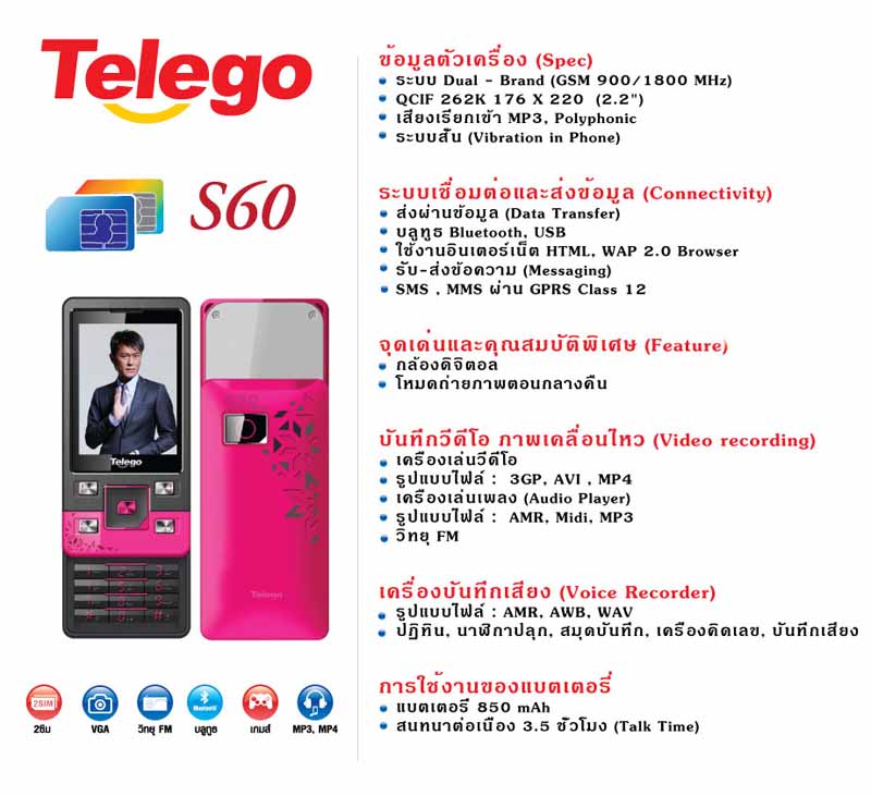 ขายโทรศัพท์มือถือ TELEGO S60 (เจ้าของเดียวกับโทรศัพท์มือถือ ฟิลิปส์) รุ่นสไล์ด สีดำ-ชมพู ราคาพิเศษ 1,500 บาทยังไม่แกะกล่อง มีตัวเดียว สนใจติดต่อ 084 643 7222 หรือ www.mobilemag.in.th/shop
