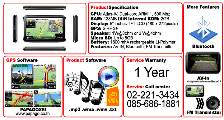 จีพีเอสนำทาง จากอิตาลี ขนาดหน้าจอ 5 นิ้ว ระบบสัมผัส แผนที่นำทาง PAPAGO X6 เวอร์ชั่นใหม่ล่าสุด ลิขสิทธิ์แท้ พร้อม Junction View ภาพเสมืิอนจริง สีสันสวยงามดูเข้าใจ และใช้งานง่าย Windows CE 6.0 มี Bluetooth ในตัว อัพเดทแผนที่ฟรี 3 ปี