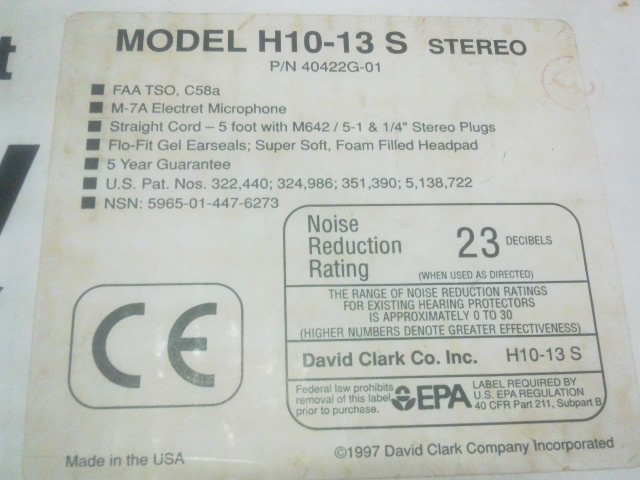 Model H10 - 13 S แทบไม่ได้ใช้งานเลย มาตรฐาน FAA - TSO C58a Noise reduction 23 dB ไมโครโฟน Electret M - 7A Super Soft, Foam filled headpad เพื่อเพิ่มความสะดวกสบายในเที่ยวบินระยะยาว Flo-Fit Gel Earseals