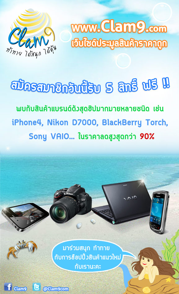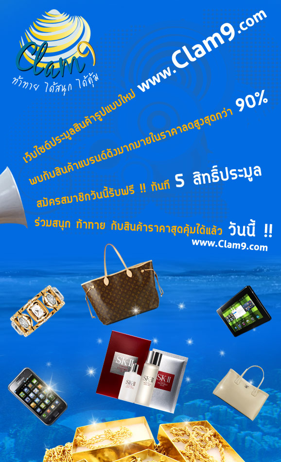 ประมูลได้ จ่ายนิดเดียว! หากคุณเป็นคนรุ่นใหม่ ชอบความสนุก เสี่ยง และ ลุ้น กับการเป็นเจ้าของสินค้าแบรนด์เนมหลากหลาย อุปกรณ์เทคโนโลยีทันสมัย ในราคาประหยัดกว่า 90% Clam9 แจกจริง ไม่มีกั๊ก แค่สมัครก็ได้บิดฟรีถึง 5 บิด!! แนะนำเพื่อนต่อได้รับอีกถึง 9 บิด!! เพื่อลุ้นประมูลสินค้าแบรนด์ดังสุดฮิปมากมาย เช่น Louis Vuitton, iPhone, iPad และ ทองคำมูลค่ามหาศาล รอให้คุณมาเป็นเจ้าของแล้ววันนี้ที่ www.clam9.com ร่วมลุ้น และตื่นเต้นได้แล้ววันนี้! ติดตามข่าวสารต่าง ๆ ของ Clam9 ได้ที่ Fan page Facebook, Twitter และ Hi5 สมัครสมาชิกวันนี้รับฟรี !! ทันที 5 สิทธิ์ประมูล ร่วมสนุก ท้าทาย กับสินค้าราคาสุดคุ้มได้แล้ว วันนี้!!