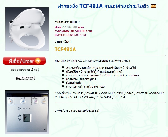 ต้องการขายฝารองนั่ง "TOTO" TCF491A แบบมืก้านชำระในตัว"ของใหม่100%"ราคา32000.-ติดต่อ022512637 พรเทพ รายละเอียดรุ่น TCF491A ฝารองนั่ง Washet SG แบบมีก้านชำระในตัว(ใช้ไฟฟ้า220V) 1.สามารถตั้งอุณหภูมและความแรงของนํ้าในการฉีดชำระได้ 2.เลือกวิธีการฉีดชำระได้ทั้งด้านหน้าและด้านหลัง 3.ก้านฉีดชำระสามารถเคลื่อนไหวไปมา เพื่อการชำระที่หมดจด 4.มีลมเป่าแห้ง 5.ควบคุมทำงานด้วย REMOTE รุ่นที่ใช้ได้ CW823J/CW688U/CW914U/C436/C406/CW795U/CW804U/CST940/CST941/CWT744/CSW744/CSW744SL/CST734