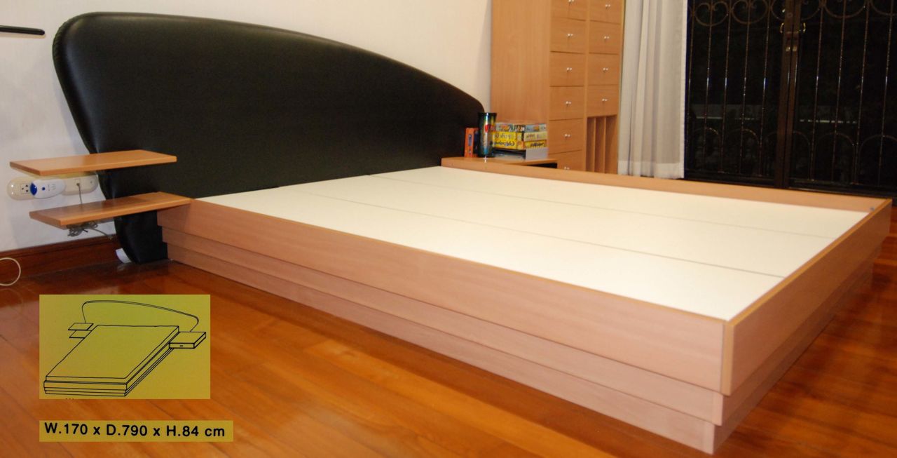 - เตียงมีชั้นวางของสำหรับ วางนาฬิกาปลุก โทรศัพท์ โคมไฟ และมีลิ้นชักสำหรับเก็บของเช่น หนังสือ