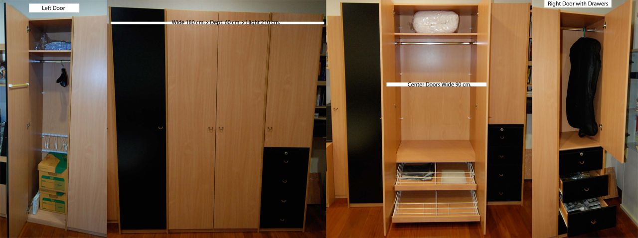 - ตู้เสื้อผ้ามีที่เนคไท ผ้าพันคอ สร้อยคอ ที่แขวนกางเกง สามารถแขวนชุดราตรียาวได้ ช่องเก็บชุดสูทผู้ชายที่ฝั่งตู้ขวามือ