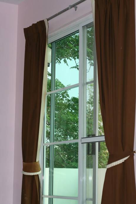 7. ม่านหน้าต่างสีน้ำตาลผ้าหนา ขนาดราวยาว 2.90 m. ความสูงของผ้าม่าน 1.90 m. 1 คู่