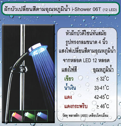 ซื้อสินค้าราคาพิเศษได้ที่ www.eggtartshop.com http://www.eggtartshop.com/product_711091_th SB i-Shower 06T ชุดราวระดับเปลี่ยนสีได้พร้อมฝักบัวเปลี่ยนสีตามอุณหภูมิน้ำ ราคา 1,250.00 บาท SB i-Shower 06T ประกอบด้วย http://www.youtube.com/watch?v=ORlw3T_Gb8s วีดีโอการทำงานของฝักบัว i-Shower 06T i-Shower 06T ฝักบัวเปลี่ยนสีตามอุณหภูมิน้ำ หัวฝักบัวดีไซน์ทันสมัย เปลี่ยนสีตามอุณหภูมิน้ำ ไม่ต้องใช้ไฟฟ้า ไม่ต้องใช้แบตเตอรี่ ใช้แค่หลักการแรงดันน้ำแปลงเป็นพลังงานให้กับหลอด LED จึงปลอดภัยไร้กังวล ติดตั้งง่ายสามารถทำได้เอง เพียงแค่ถอดหัวฝักบัวอาบน้ำเดิมของท่านออก แล้วหมุนเกลียวหัวฝักบัว i-Shower เข้าแทนที่ก็สามารถใช้งานได้ทันที ผลิตจากพลาสติก ABS เคลือบโคเมี่ยม
