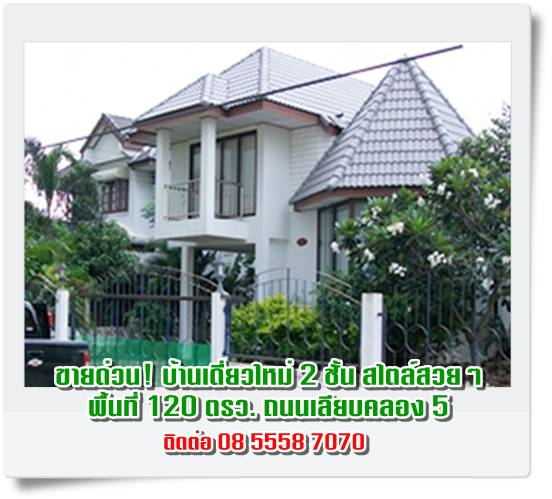 ขายด่วน บ้านเดี่ยว ทรงสวย 2 ชั้น ใหม่ๆ สวยๆ พื้นที่ 120 ตรว. อยู่บ้านสวนรีสอร์ท ถนนเลียบคลอง 5 คลองหลวง