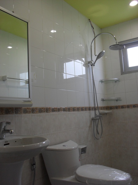 - ฝ้าเพดานห้องน้ำทุกห้องทาสีกันแบคทีเรียสีเหลืองสว่าง สร้างบรรยากาศให้ห้องน้ำ