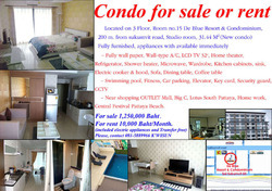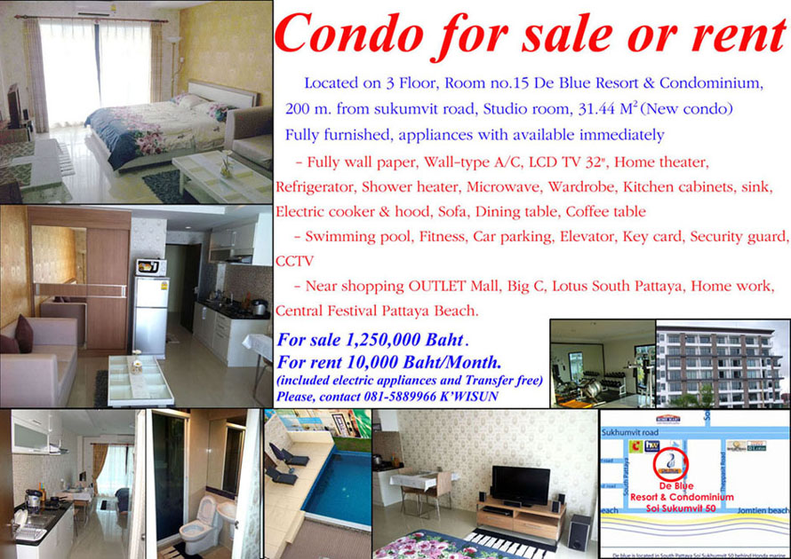 ขายถูกกว่าเป็นแสนหรือให้เช่า De blue resort & condominium ติดสุมวิทพัทยา (south pattaya) ห่างสุขุมวิทเพียง 200m. อยู่ในซอยสุขุมวิท 50 ใกล้แยกเทพประสิทธิ์ ใกล้พัทยาใต้ ใกล้ห้าง Lotus พัทยาใต้, Outlet mall, Home work, Big C และเดินทางไม่เกิน 15 นาที ก็ถึงชายหาดหรือ Central pattaya beach ครับ ห้องไม่ค่อยได้อยู่ครับ มือ 1 สภาพใหม่และเป็นคอนโดใหม่ ชั้น 3 ห้องเบอร์ 15 อายุอาคารประมาณ 1 ปีกว่า ห้อง Studio ขนาด 31.44Sq m. อยู่ฝั่งสุขุมวิทติด Honda marine ครับ ตัวห้องพอเห็นวิวภายนอกบ้างครับ ห้องไม่โดนแดดเยอะครับ บรรยากาศดี เงียบสงบ และเป็นส่วนตัวมากครับ ตัวอาคารมีทั้งหมด 8 ชั้น (นับชั้นล่างลานจอดรถ) ห้องมีทั้งหมดประมาณ 75 ห้อง เป็นคอนโดไม่ไหญ่มากครับเหมาะแก่การพักผ่อนจริงๆ ตกแต่งพร้อมเข้าอยู่ได้ทันที หิ้วกระเป๋ามาใบเดียวก็อยู่ได้เลยครับ เครื่องใช้ไฟฟ้า ตามรูปครับ ขาย (sale) 1,250,000Baht (ไม่ลดแล้วนะครับ เพราะลดให้แล้วจริงๆแสนกว่าๆจากราคาที่ Condo ขาย) หรือให้เช่า 10,000 บาท/เดือน ขายรวมเครื่องใช้ไฟฟ้าทุกอย่างที่อยู่ในห้อง และทุกอย่างที่เห็นในรูปครับ และส่วนกลางของ Condo มีสระว่ายน้ำ, Fitness, ที่จอดรถ, Lift 1 ตัว, Mail box, CCTV ชั้นละ 2 ตัว, Security guard 24 ชั่วโมง สนามพัตต์กอล์ฟ, Key gard ค่าส่วนกลาง 30 บาท/ ตร.ม ครับ ราคานี้ถูกจริงๆครับ ขายถูกกว่า Condo ขายเป็นแสนกว่าๆ เช็คได้เลยครับ ห้องนี้เจ้าของขายเองครับและขายด่วนครับ เพราะว่าต้องการย้ายที่อยู่ ยินดีทำเรื่องกู้แบงค์ให้ครับ
