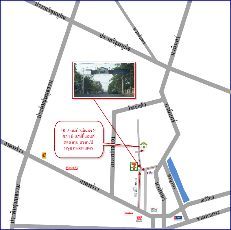 จาก ถนนลาดพร้าว ให้เข้าถนนแฮปปี้แลนด์ สาย 1 (ตรงข้ามระหว่างเดอะมอลล์บางกะปิ กับตลาดนัดตะวันนา) แล้วตรงไป ประมาณ 1 กิโลเมตร จะพบทางเข้าหมู่บ้านสินธร ตรงทางโค้ง ให้ตรงเข้ามาในหมู่บ้าน 400 เมตร ให้สังเกตุทางขวา จะเห็นป้ายหมู่บ้านสินธร ซอย 8 ให้เลี้ยวขวาเข้าซอย จะพบบ้านเลขที่ 952 ทางซ้ายมือ