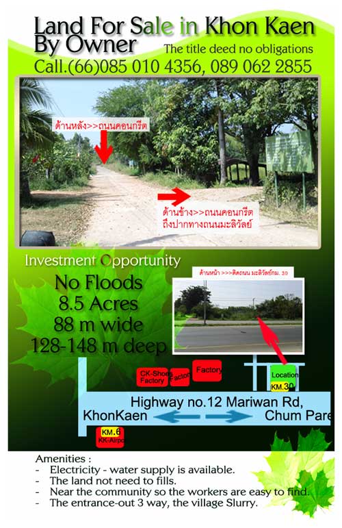 The distance from the Khon Kaen Airport up to the land is take time approximately 20 minute along the highway 12 Khon kaen - Chum Pare, when reached the kilometer marker 30 stand in front of the land.