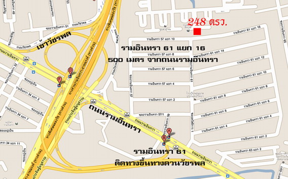 ขายที่ทำเลสวย ที่ดินเปล่า ที่สวย ถมแล้ว 248ตรว กว้างxลึก (30x35เมตร)รามอินทรา ก.ม.6ซอยรามอินทรา 61แยก 16เข้าซอยแค่ 500เมตร หมู่บ้านสวัสดิการนายทหาร ติดถนนเมน คสล กว้าง 8เมตร แปลงเลขที่ 111ทำเล ติดทางขึ้นทางด่วนรามอินทราวัชรพล และ สถานีรถไฟฟ้าสีชมพู ท่าวัชรพล เหมาะสร้างบ้าน สร้างอพาร์ทเม็นท์สามารถทำทางเข้าออก ตลาดถนอมมิตร ถนนวัชรพลได้ด้วย ราคา 45000บาท/ตรว (รวมโอน)ภายในปี 2554 เพราะปีหน้า จะมีการปรับราคาที่ดินขึ้นอีก 20%-30% เพราะทำเลสวย เข้าออกได้ หลายทาง และ ติดท่าสถานีรถไฟฟ้าสายสีชมพู ท่าวัชรพล ดูรูปที่ดินได้ที่