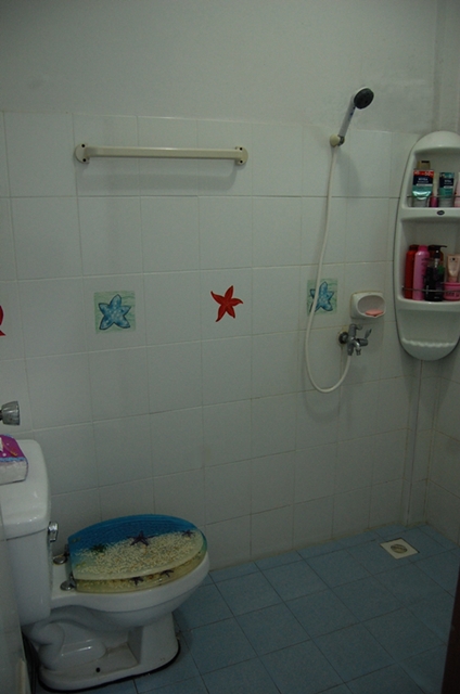 ห้องน้ำ ประกอบด้วย ก็อกน้ำ 2หัวจ่ายเซรามิค ชั้นวางของ โถชักโครกทั้ง 2 ห้อง