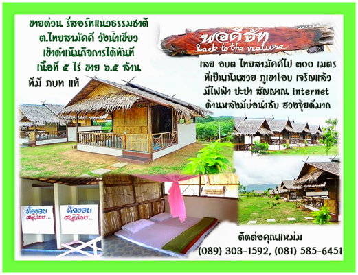 ขาย พอดี ฮัท รีสอร์ท อยู่ ตำบลไทยสามัคคี วังน้ำเขียว ( อยู่เลย อบต ไทยสามัคคีไป ๓๐๐ เมตร ) มีที่พักสร้างไว้แล้ว ๘ หลังคาเรือน ห้องน้ำในตัว พร้อมเครื่องทำน้ำอุ่น และทีวี พื้นที่อยู่บนเนินสวย มีภูเขาโอบ ด้านหลังเป็นบ่อน้ำซับ ฮวงจุ้ยดีมาก อากาศดี สภาพแวดล้อม สะอาด ปลอดภัย สาธารณูปโภคพร้อม ไฟฟ้า น้ำปะปา และสัญญาณอินเตอร์เน็ท พื้นที่รวม ๕ ไร่ ขาย ๖.๕ ล้าน ติดต่อ คุณแหม่ม (089) 303-1592, (081) 585-6451