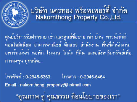 | ติดต่อ: | บริษัท นครทอง พร็อพเพอร์ตี้ จำกัด | อีเมล์: | |||