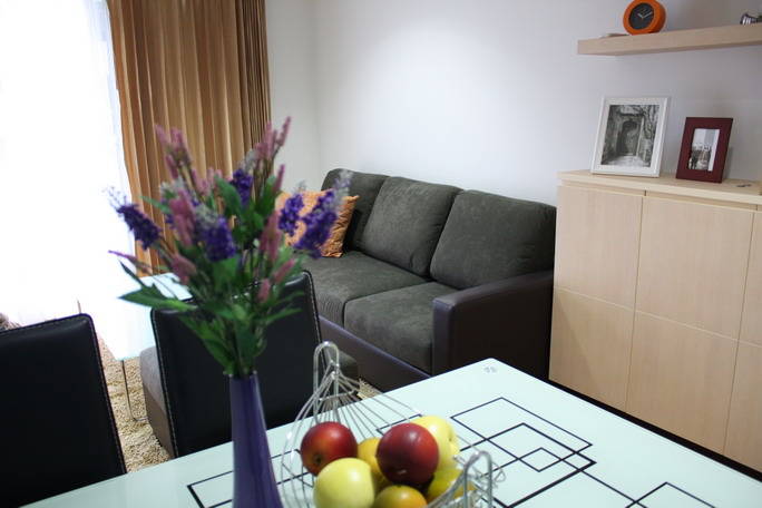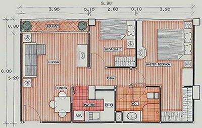 - 1 ห้องนอนใหญ่ พร้อมเตียง 6 ฟุต (pocket springs) , 1 ห้องนอนเล็ก พร้อมเตียง 3.5 ฟุต (ทั้งสองห้องมีหน้าต่างหันไปทางสระว่ายน้ำ กระจกสูง จากพื้นถึงเพดาน)- 1 ห้องนั่งเล่น (ติดกับระเบียงด้านสระว่ายน้ำ)