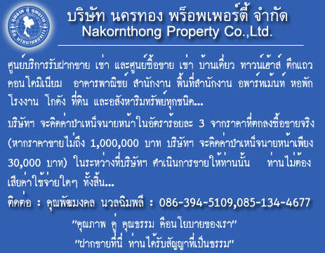 | ติดต่อ: | บริษัท นครทอง พร็อพเพอร์ตี้ จำกัด | อีเมล์: |  |