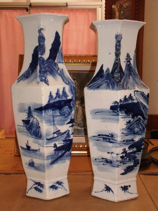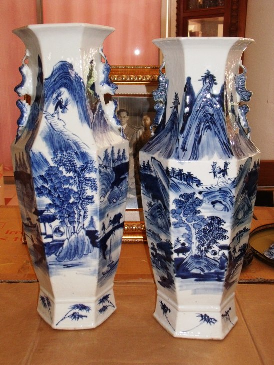 แจกันลายคราม 6 เหลี่ยมลายเขาไม้คู่ 2 ใบ ใหญ่ๆ สวยๆ และของเก่าอีกหลายอย่างสนใจติดต่อ 081-5765431 เบสครับ