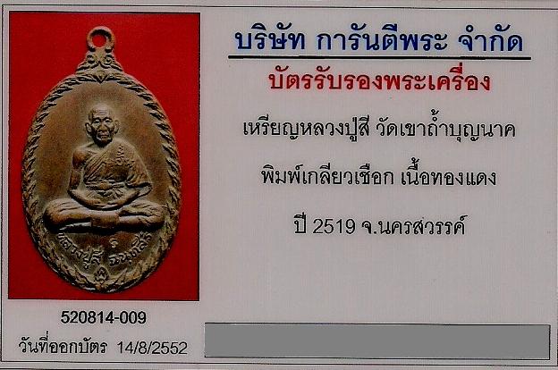 เหรียญแห่งชัยชนะ เกลียวเชือก ทองแดงบล็อกนวโลหะ สุดยอดเหรียญประสบการณ์อีกรุ่นของ หลวงปู่สี ฉนฺทศิริ วัดเขาถ้ำบุญนาค สร้างเมื่อปี 2519 จัดสร้างเพียง 5000 เหรียญ ตอกโค้ตตัว ส ลึกคมชัดหายากยิ่งและสภาพสมบูรณ์เท่าที่เห็นยิ่งยากกว่า สวยมากๆๆแชมป์ รับประกันความแท้ พร้อมบัตรรับรอง หลวงปู่สี พระมหาเถระผู้มีอายุยืนนานถึง ๑๒๘ ปี จนได้ฉายา "พระอรหันต์ ๗ แผ่นดิน" พระอภิญญาจารย์ผู้มีสังขารเป็นอัมตะ(สังขารไม่เน่าเปื่อย) ลป.สี ท่านเป็นศิษย์ สมเด็จพระพุฒจารย์โต พรหมรังสี วัดระฆังฯ เป็นสหมิกธรรมกับ ลป.ศุข วัดปากคลองมะขามเฒ่า/ลพ.กลั่น วัดพระญาติ/พระอาจารย์มั่น ภูริทัตโต และ ลป.สี ท่านยังเป็นอาจารย์ของพระอาจารย์ดังๆแห่งยุคอีกหลายรูป อาทิ ลพ.พรหม วัดช่องแค /ลป.แหวน วัดดอยแม่ปั๋ง /ลป.บุดดา วัดเจริญกลางชูศรี /ลพ.ฤษีลิงดำ วัดท่าซุง เป็นต้น @@@@ เนื้อทองแดงบล็อกนวะโลหะ ทองแดงที่ใช้จะมีส่วนผสมของนวะอยู่ทำให้ทองแดงมีสีเข้มและบล็อกนวะโลหะ เนื่องจากมีการปั้มเนื้อนวะโลหะอยู่น้อยมากทำให้บล็อคมีความสมบูรณ์ เหรียญที่ใช้บล็อคนวะโลหะก็จะมีความคมชัดสูงมากกว่าบล็อกธรรมดา อย่างเห็นได้ชัดเจนและที่สำคัญอีกประการหนึ่งโค้ดที่ตอกด้านล่างจะอยู่ใต้ อาสนะประมาณกลางๆและมีความชัดเจนและลึกกว่าโค้ดทองแดงธรรมดาดังที่ปรากฏใน รูป @@@@