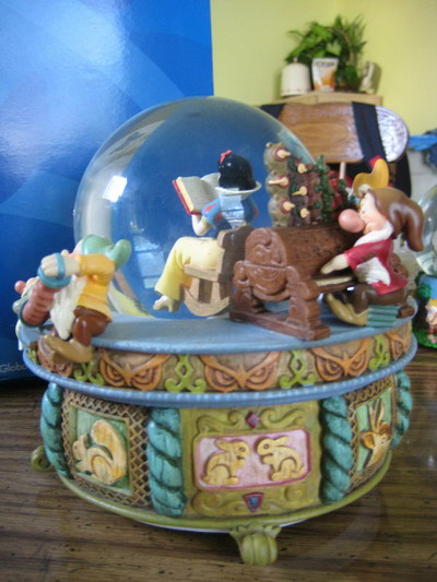 ลูกแก้วดนตรีเจ้าหญิงสโนไวท์กับคนแคระทั้ง 7 สินค้าจาก Disney Store นำเข้าจากอเมริกาค่ะ เมื่อไขลานที่ฐานลูกแก้วจะบรรเลงเพลง “ I Whistle A Happy Tune” และมีกลไกพิเศษทำให้เก้าอี้โยกของสโนไวท์เคลื่อนไหวตามเสียงดนตรีค่ะ ลูกแก้วชิ้นนี้เป็นงานเรซิ่นค่อนข้างหนัก ขนาดเส้นผ่าศูนย์กลางประมาณ 7 นิ้ว สูงประมาณ 8 นิ้ว ลงสีสดใสมีชีวิตชีวา ลูกแก้วเป็นแก้วใสแจ๋ว มีกระดาษแก้ววิบวับอยู่ด้านใน โมเดลชิ้นนี้ไม่มีกล่องนะคะ(กล่องโมเดลลอยตุ๊บป่องๆไปกับน้ำท่วมแล้วค่ะ) ปัจจุบันลูกแก้วนี้ตั้งโชว์สวยงามรอผู้จับจองอยู่ในตู้กระจกในสภาพสมบูรณ์ค่ะ
