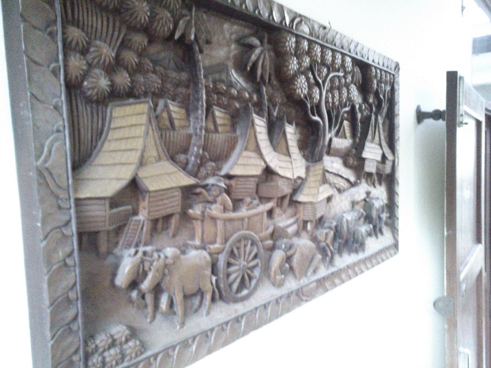 เป็นไม้ชิ้นเดียวครับ สลักเป็นเรื่องของกิจกรรมชาวบ้านในหมู่บ้าน งานแกะสลักด้วยมือ อายุ ประมาณ 25 ปีครับ แผ่นใหญ่ครับ ขนาด 1.02m x 0.50 m (102 cm x 50cm)