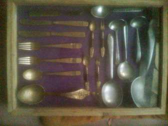 ขายชุดช้อนซ้อมทองเหลือเก่า ทัพพีอลูมิเนียมแข็งสมัยเก่าพร้อมกล่องไม้โชว์ เป็นของเก่าสะสม ขายยกชุด 2,500 บาท โทร.085-168-6533