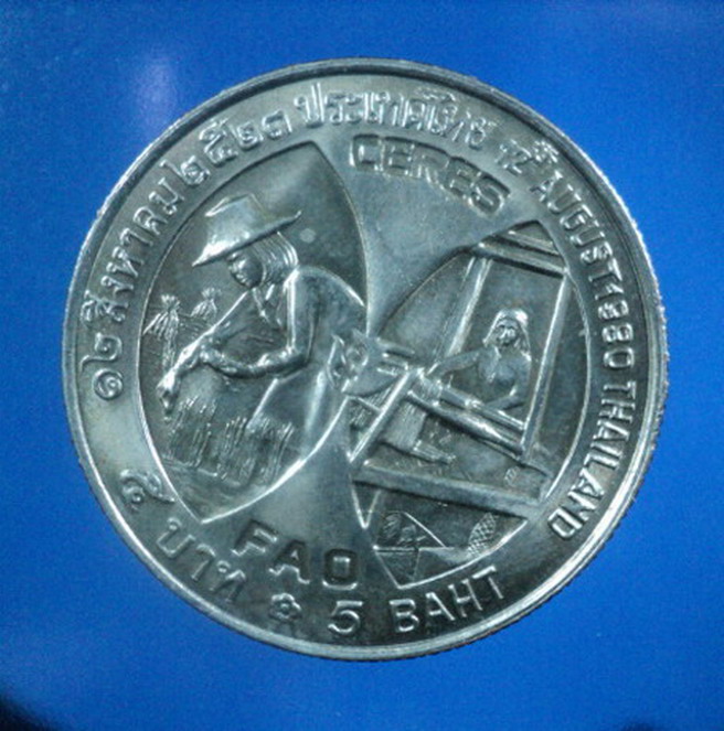 เหรียญกษาปณ์5 บาทที่ระลึกในวโรกาสที่องค์การอาหารและเกษตรแห่งสหประชาชาติ ถวายพระเกียรติอัญเชิญ พระบรมฉายาสาทิสลักษณ์สมเด็จพระนางเจ้าสิริกิติ์พระ บรมราชินีนาถลงบนเหรียญ CERES ปี 2523 สภาพสวยเหมือนใหม่
