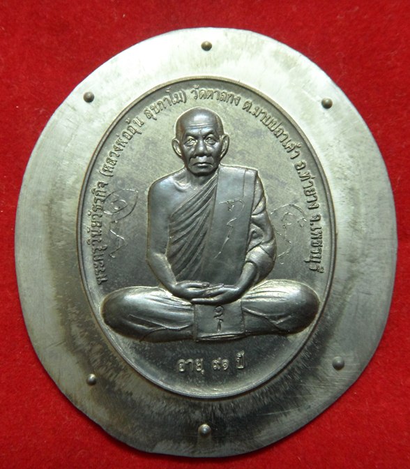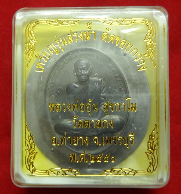 เหรียญสรงน้ำ ลองพิมพ์ เนื้อตะกั่ว หลวงพ่ออุ้น วัดตาลกง ปี 2550 จำนวนการสร้าง 199 เหรียญเหรียญนี้เป็นเหรียญไม่ตัดปีก จารด้านหน้าแล้วหลัง + กล่องเดิม www.phrathaicenter.com