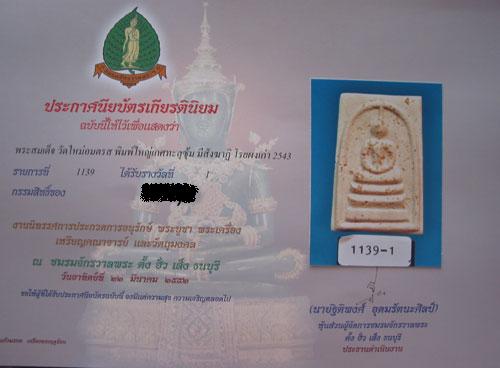 สมเด็จบางขุนพรหม ปี43 พิมพ์ใหญ่ทะลุซุ้ม A มีสังฆาฎิ เปลวทอง โรยผงเก่าปี 09,17,31 พร้อมใบประกวดที่ 1 งานชมรมจักรวาลพระ ตั้งฮั่วเส็ง ธนบุรี
