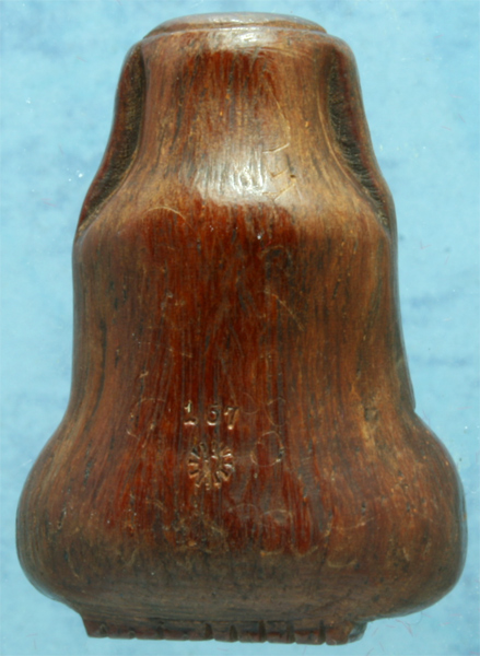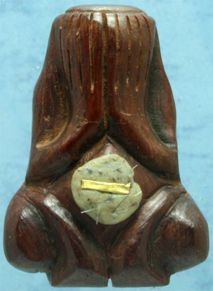 แกะจากไม้พยุงแดง ด้านหน้าบรรจุด้วยผงพุทธคุณผสมผงไม้เทพโคตร ตะกรุดทองคำ เส้นเกศา