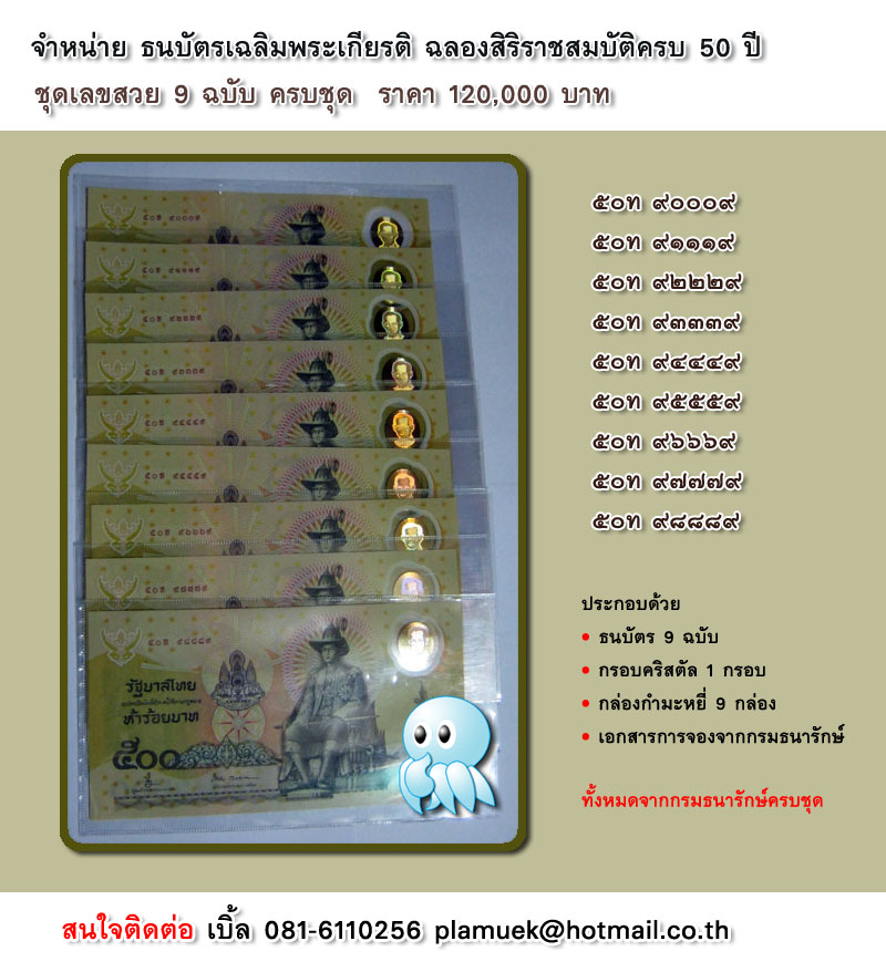จำหน่าย ธนบัตรเฉลิมพระเกียรติ ฉลองสิริราชสมบัติครบ 50 ปี ชุดเลขสวย 9 ฉบับ ครบชุด ราคา 120,000 บาท