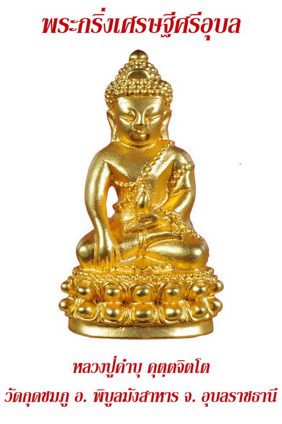 พระกริ่งและชัยวัฒน์เศรษฐีศรีอุบล เนื้อนวะโลหะ หุ้มด้วยทองคำสวิสแท้ 99.99 % โดยหลวงปู่คำบุ คุตตจิตโต วัดกุดชมภู อ. พิบูลมังสาหาร จังหวัดอุบลราชธานี พิธีพุทธาภิเษก เมื่อวันที่ 1 เมษายน พ.ศ. 2554 โดยหลวงปู่คำบุ คุตตจิตโต วัดกุดชมภู อ. พิบูลมังสาหาร จังหวัดอุบลราชธานี วัตถุประสงค์... เพื่อร่วมจัดซื้อทองคำแท่งน้ำหนัก 49 บาท เพื่อบรรจุไว้บนยอดเจดีย์ศรีชมภู ณ วัดกุดชมภู และ