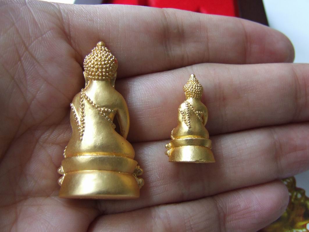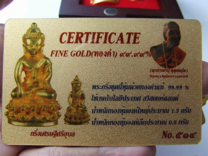 กองทุนสร้างศาลาการเปรียญหลังใหม่ ณ วัดกุดชมภู อ. พิบูลมังสาหาร จังหวัดอุบลราชธานี โดยที่พระกริ่งและชัยวัฒน์เศรษฐีศรีอุบล เนื้อนวะโลหะทุกองค์ส่งไปหุ้มด้วยทองคำสวิสแท้ 99.99 % ที่ประเทศไต้หวัน โดยใช้เทคโนโลยีจากประเทศสวิสเซอร์แลนด์ นอกจากนี้พระกริ่งและชัยวัฒน์เศรษฐีศรีอุบล ทุกองค์จะมีการตอกโค๊ดและหมายเลข พร้อมใบ certificate (ทองคำ) ระบุหมายเลขประจำองค์ทุกองค์ และทำการบรรจุอยู่ในกล่องไม้สวยหรู ฝาปิดๆด้วยแม่เหล็กอย่างดี ให้ทุกชุดนะครับ จำนวนการสร้างเพียง 599 ชุดเท่านั้น โดยพระกริ่งเศรษฐีศรีอุบล จะมีขนาดฐานกว้าง 2 เซนติเมตร และ สูง 4 เซนติเมตร และพระชัยวัฒน์เศรษฐีศรีอุบล จะมีขนาดฐานกว้าง 1.2 เซนติเมตร และ สูง 2.3 เซนติเมตร 1. พระกริ่งและชัยวัฒน์เศรษฐีศรีอุบล เนื้อนวะโลหะ หุ้มด้วยทองคำสวิสแท้ 99.99 % หลวงปู่คำบุ สร้าง 599 ชุด ราคา 5,000 บาท ( หมายเลข 514 ) โดยพระกริ่งวิมลสมณวัตร + พระชัยวัฒน์ ทั้งคู่บรรจุอยู่ในกล่องไม้สวยหรู ฝาปิดๆด้วยแม่เหล็กอย่างดี ตอกโค๊ตและหมายเลขกำกับทุกองค์ สีสวยสวยงาม มีเอกลักษณ์เฉพาะองค์ อนาคตไกล น่าเก็บรักษาอย่างยิ่ง สนใจนัดดูพระองค์จริงได้ครับ หรือ บริการส่ง EMS ทั่วประเทศ (ค่าส่ง 50-100 บาท ตามจำนวนและน้ำหนัก) รับประกันของแท้ 100 % ยินดีคืนเงินเต็มจำนวน