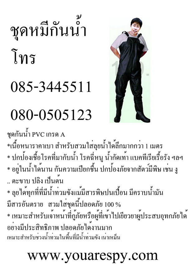 รายละเอียด: ชุดหมีกันน้ำ เสื้อกับรองเท้าติดกัน เหมาะสำหรับภาวะน้ำท่วม กัน แมลง สัตว์ และ ไฟฟ้าช๊อต กันน้ำสูง 1-1.5 เมตร ตามขนาดความสูงของผู้สวมใส่ เนื้อผ้าโฟลี่เมอร์กันน้ำ 100 เปอร์เซ็นต์ เนื้อผ้าหนา 4-5 มิลลิเมตร ลูกค้าที่มารับเองที่ร้าน http://yourwader.tarad.com/product.detail_852178_th_4261723 ติดต่อเรา you are spy 522/175 ซอยทรัพย์ธานี ดินแดง ดินแดง กทม 10400 lat 13.757617 long 100.563086 กรุงเทพมหานคร 10400 ไทย
