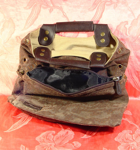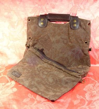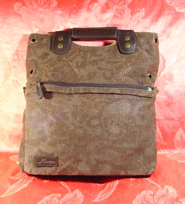 กระเป๋า ผ้ายีน เป็นผ้ายีนสีน้ำตาล หูจับทำด้วยหนัง และยังแกะออกเพื่อเปลี่ยนเป็นสายสะพายได้ด้วย ด้านนอกมีกระเป๋าซิปหนึ่งใบ ด้านในหนึ่งใบ และ ด้านข้างยังมีกระเป๋าอีกใบติดอยู่และสามารถแยกออกจากกันได้อีกหนึ่งใบ