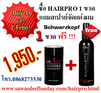 หากคุณเป็นคนหนึ่งที่มีปัญหาผมบาง ผมน้อย รอยแสกกว้าง เราขอเสนอวิธีการง่ายๆที่คุณสามารถแก้ไขปัญหาเหล่านี้ได้ด้วยตัวคุณเอง เพียงแค่ 30 วินาทีเท่านั้น ผมของคุณจะดกดำอย่างเป็นธรรมชาติ คืนความเป็นหนุ่มสาวและบุคลิกภาพที่ดีกลับคืนมา ด้วยผลิตภัณฑ์เสริมเส้นผม HAIRPRO จากประเทศสหรัฐอเมริกา HAIRPRO ไม่ใช่ยาปลูกผม HAIRPRO มีลักษณะเป็นเส้นใยโปรตีนเล็กๆ ซึ่งเป็นเส้นใยเคอราตินเช่นเดียวกับเส้นผม HAIRPRO มีประจุไฟฟ้าสถิตย์ซึ่งเมื่อโรยลงไปในบริเวณที่ผมบางและรอยแสกกว้างแล้วก็จะเกาะติดกับเส้นผมที่ยังคงเหลืออยู่บนหนังศีรษะ ทำให้เส้นผมแลดูหนาและดกดำขึ้นอย่างเป็นธรรมชาติ HAIRPRO ไม่ใช่สี แต่เป็นเส้นใยโปรตีนเล็กๆ จึงไม่ไหลเปรอะเปื้อนเสื้อผ้าในเวลาเหงื่ออก สามารถปัดออกได้ง่าย คุณจึงสามารถประกอบกิจกรรมต่างๆในแต่ละวันได้ตามปกติ วิธีการใช้ก็ง่าย เพียงคุณจัดแต่งทรงผมให้เรียบร้อยแล้วก็โรยผง HAIRPRO บริเวณที่ผมบางและรอยแสกกว้าง หลังจากนั้นใช้ฝ่ามือตบเบาๆเพื่อให้ผง HAIRPRO กระจายตัวจนทั่วบริเวณ ขั้นตอนสุดท้ายคือฉีดสเปรย์จัดแต่งทรงผมเพื่อให้ HAIRPRO อยู่ทรงได้นานตลอดทั้งวัน หากต้องหวีผมก็ใช้หวีซี่ห่างๆ วิ่งฝ่าสายฝนที่ตกปรอยๆได้ และ HAIRPRO ยังล้างออกง่ายโดยการสระผมด้วยแชมพูทั่วไป HAIRPRO เป็นเส้นใยโปรตีนที่ไม่ทำปฏิกิริยาหรือก่อความระคายเคืองใดๆต่อหนังศีรษะ คุณสามารถใช้ HAIRPRO ได้บ่อยเท่าที่ต้องการ คืนความมั่นใจ เสริมบุคลิก เพิ่มผมหนา ปิดผมบางภายในเวลาเพียง 30 วินาทีเท่านั้น พิเศษ !!!ซื้อผลิตภัณฑ์ HAIRPRO ขนาด 28 กรัม จำนวน 1 ขวด ในราคา 1,950 บาท (จากราคาปกติ 2,500 บาท) แถมสเปรย์จัดแต่งทรงผม Schwarzkopf ขนาด 200 มล. จำนวน 1 ขวด ฟรี !!! สนใจผลิตภัณฑ์ HAIRPRO ติดต่อที่เวบไซต์นี้ได้เลยครับ http://sawasdeefineday.com/hairpro.html