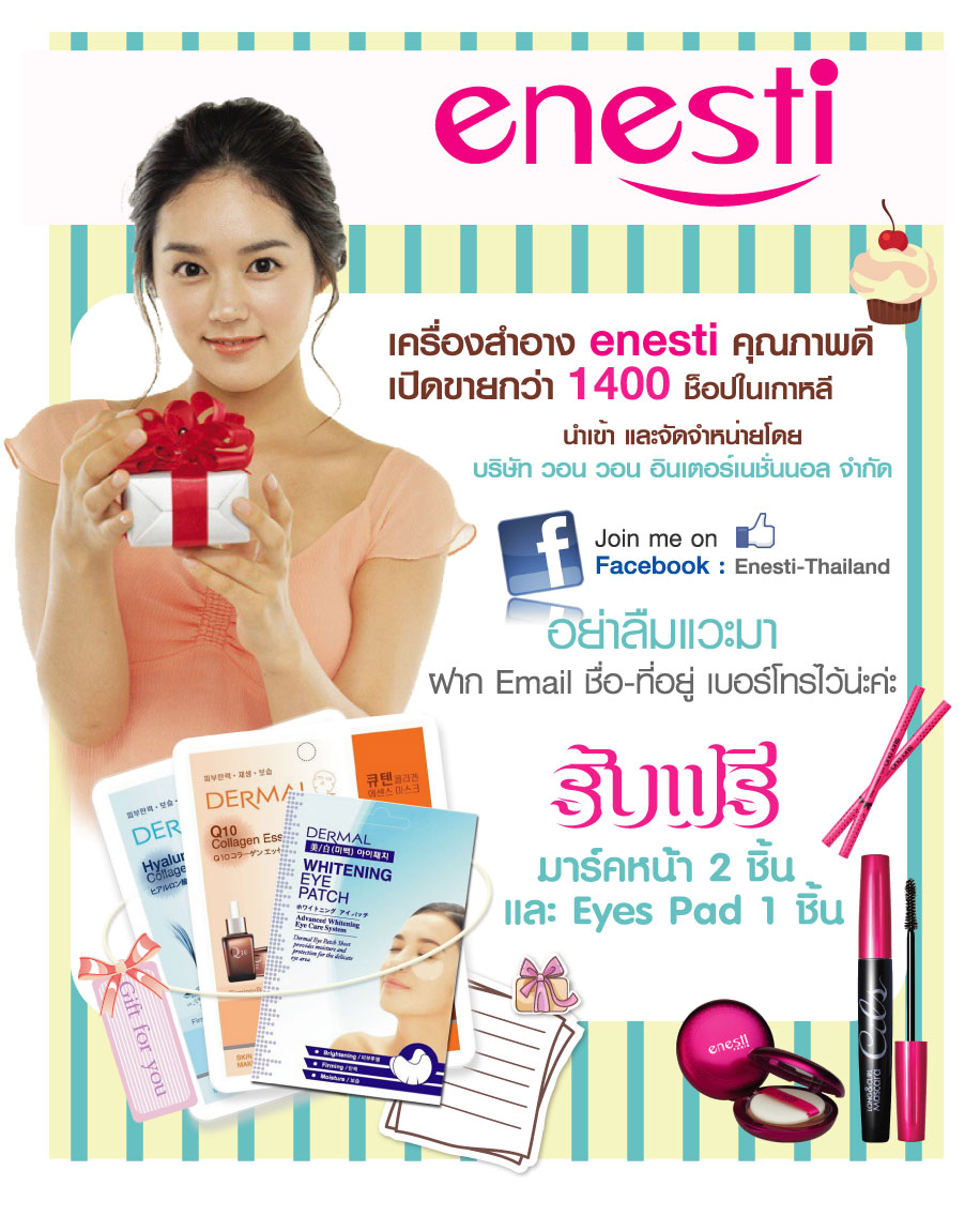 เครื่องสำอาง enssti ฉลองต้อนรับเทศกาลปีใหม่ โดยการแจกฟรี มาร์คหน้า 2 และ eyes pad 1 ส่งตรงถึงบ้านคุณ เพียงคุณเข้าไปลงทะเบียน ได้ที่เฟสบุ๊ค http://www.facebook.com/pages/Enesti-Thailand/289074877801510 ฝาก ชื่อ ที่อยู่ พร้อมเบอร์โทรศัพท์