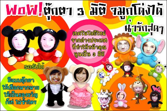เพียงแค่คุณมีรูปถ่ายของคุณเอง หรือคนที่คุณรัก ก็สามารถทำเป็นตุ๊กตา น่ารักๆ จมูกโด่ง หน้าเด้งได้ โดยไม่ต้องพึ่งศัลยกรรมให้ยุ่งยาก ไอเดียใหม่ สุดเก๋ ด้วยเทคโนโลยีจากต่างประเทศ สามารถทำเป็นของขวัญ สุดพิเศษ ได้ไม่ซ้ำใคร มีแบบตุ๊กตาขนนุ่มน่ารักน่ากอด ให้เลือกมากมายหลายแบบ ทั้ง ขนาดเล็ก กลาง ใหญ่ หรือ ให้เป็นของขวัญพิเศษในโอกาสต่างๆ ทั้ง ตุ๊กตาชุดรับปริญญา ทุกแบบ ทุกสถาบัน ตุ๊กตาคู่รัก สำหรับงานแต่ง ตุ๊กตากล่องดนตรี ตุ๊กตาที่สามารถอัดเสียงได้ นอกจากนี้ยังมี ตุ๊กตาน่ารักๆ สุดฮ็อต อย่าง Angry birds มากมายหลายแบบ และทางร้านมีแบบตุ๊กตาใหม่ๆที่ไม่ซ้ำใครออกมาเรื่อยๆ อย่าลืมมอบของขวัญไอเดียเก๋ๆ ด้วยตุ๊กตาหน้าเด้ง 3 มิติ และตุ๊กตาน่ารักๆ อีกมากมาย เป็นของขวัญสุดพิเศษ ไม่ซ้ำใครได้แล้ววันนี้ ที่ www.ipomgiftshop.com ติดต่อสอบถามหรือสั่งซื้อสินค้าที่ 081-9913688 ป้อม ค่ะ
