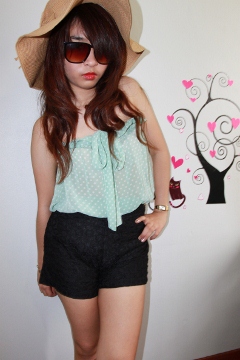 เนื้อผ้าทิ้งตัวนิดหน่อย มีสายสำหรับผูกเป็นโบว์ตรงหน้าอก หรือจะเปลี่ยนเป็นสายคล้องคอก้อได้ค่ะ