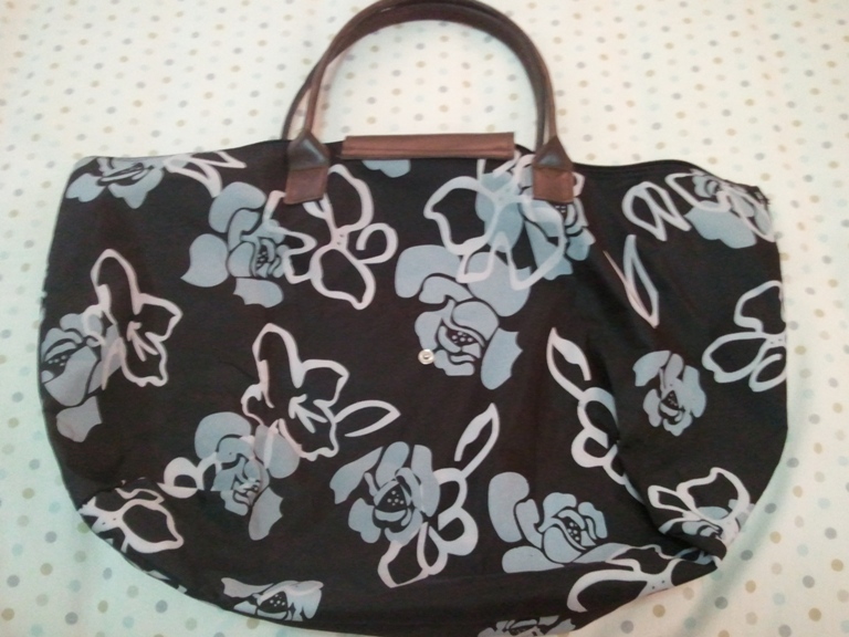 กระเป๋า shopping สไตล์ Longchamp จุของได้จำนวนมาก เหมาะสะพายทั้งวันทำงานและวันพักผ่อน ลายและสีกระเป๋าเป็นสี classic พื้นกระเป๋าสีดำ ตัดด้วยลายดอกกุหลาบ ขาวหม่นและฟ้าเทา
