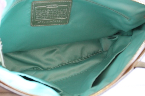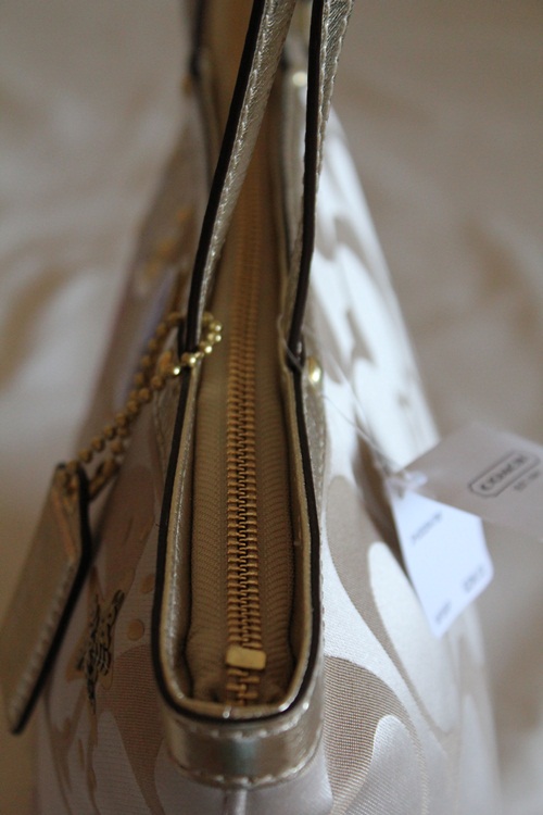 6. COACH SIGNATURE DUFFLE - KHAKI / GOLD 15067 6,340 บาท ใบนี้เป็นใบใหญ่ สีน้ำตาลทอง สวยหรูทีเดียว ข้างในบุด้วยผ้าซาตินสีชมพูเพิ่มควมน่าใช้เข้าไปอีกค่ะ ปรับความยาวสายเป็น cross body ได้นะคะ Size: 13" L x 11"