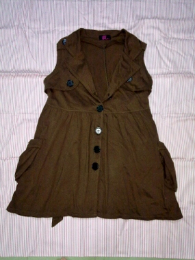>>USED<< เสื้อคลุมแขนกุดตัวยาวสีน้ำตาลผ้าคอตตอน มีสายที่เอวสำหรับผูกโบว์ ปกทรงสูท ผ้านิ่มมากค่ะ ราคา 100 บาท