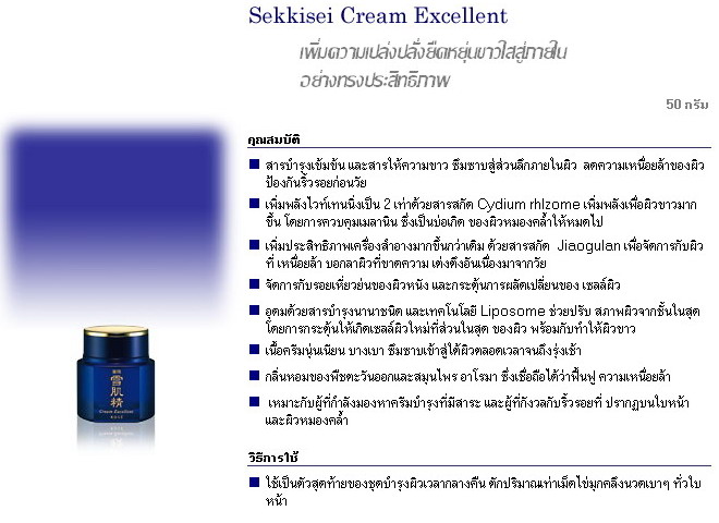 Kose-Sekkisei Cream Excellent สารบำรุงเข้มข้น และสารให้ความขาว ซึมซาบสู่ส่วนลึกภายในผิว ลดความเหนื่อยล้าของผิว ป้องกันริ้วรอยก่อนวัย