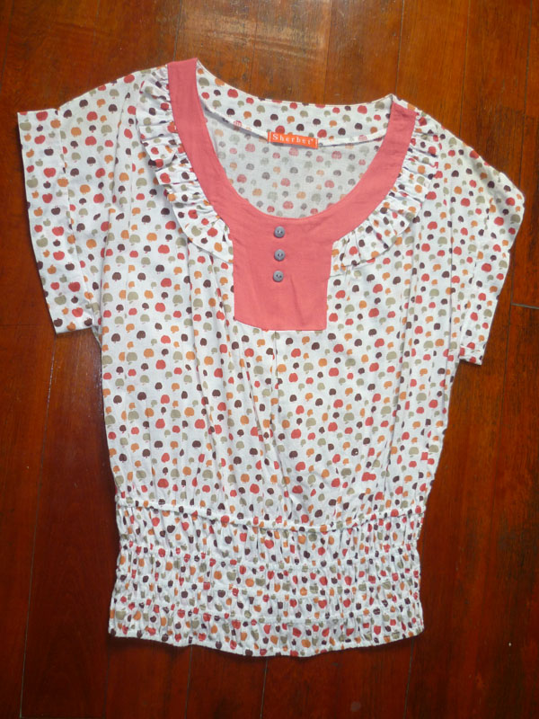 2. เสื้อ Sherbet สีชมพู พื้นขาวมีลายรูปแอปเปิ้ล ชายเสื้อเป็นสม็อค เก๋ไก๋ ขนาด รอบแขน 17 นิ้ว รอบอก 38 นิ้ว เอวเป็นสม็อค ยืดได้ ยาว22 นิ้ว วัดจากไหล่ ราคา 100 บาท