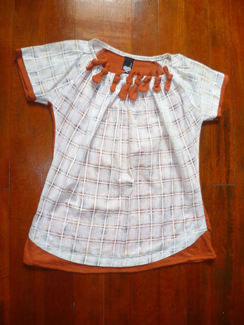 5. เสื้อยี่ห้อ TANON สีส้มอิฐ คอกลม ผ้ายืด ด้านหน้ามีลายตารางหมากรุกสีขาว บริเวณรอบคอมีโบร์ผูกเป็นลาย ขนาด รอบแขน 13 นิ้ว รอบอก 38 นิ้ว รอบอก 36 นิ้ว ยาว 24 นิ้ว วัดจากไหล่ ราคา 100 บาท