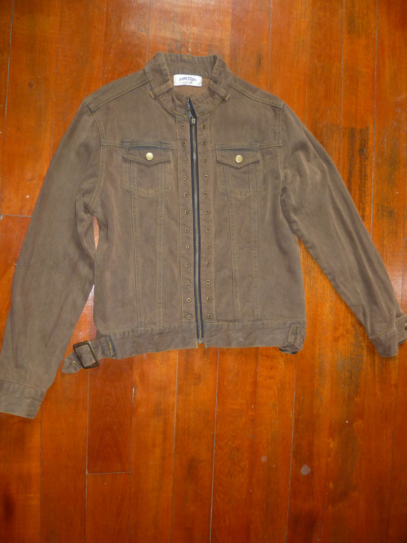 6. Jacket สีน้ำตาลสนิม แบบเท่ๆ มีกระเป๋าบนเล็กสองข้าง ด้านข้างลำตัวมีเข็ดขัดปรับขนาดสองข้าง ใส่แบบพอดีตัว ด้านหน้าเป็นซิป มีลายตอกหมุด ขนาด รอบแขน 14 นิ้ว แขนยาว 22 นิ้ว วัดจากไหล่ รอบอก 36 นิ้ว รอบเอว 36 นิ้ว ราคา 180 บาท