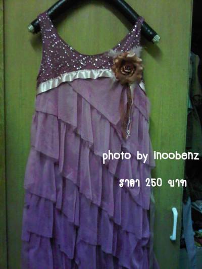 เดรสสีม่วง ปักเลื่อมและเป็นผ้าชีฟองชั้นๆ มีเข็มกลัดดอกไม้ที่อก (ตามรูป)