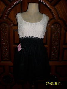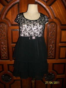 5.เดรสลูกไม้สีครีม ต่อกระโปรงผ้ามุ้งสีดำปักลายวิบวับ มีซับใน อก 32 เอวก่อนยืด 22 สะโพก Free ยาว 31 ขาย 200 บาท