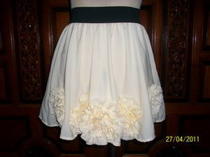 6.กระโปรง Chiffon พลิ้ว ๆ สี Vanilla ติดดอกไม้ 5 ดอก เอวก่อนยืด 22 ยาว 16 ขาย 200 บาท
